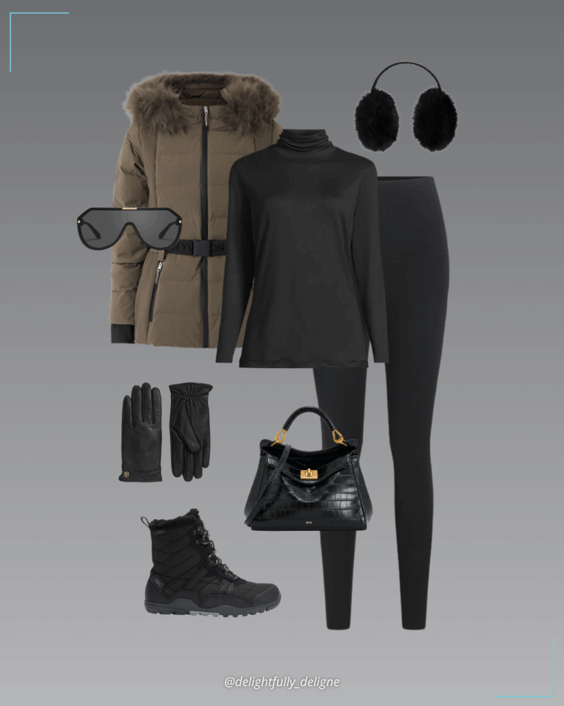 This look is the definition of cozy meets polished. A warm baselayer and lounge leggings create comfort, while the belted ski jacket and structured handbag elevate the entire outfit for everyday winter wear.